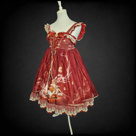 Traumhaftes Sugar Girl Lolita Jumper Skirt (JSK) – Weinrot mit Gold Drachen-Print