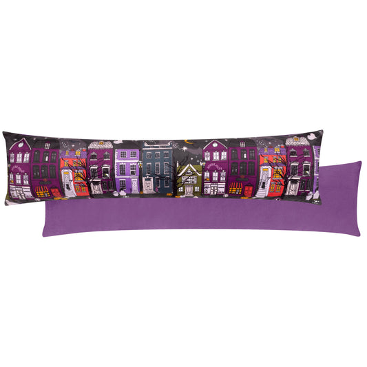 Kultiger "Creepy Town" Halloween Türstopper aus Samt violett 90 cm