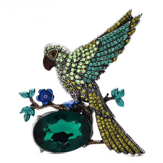 Vintage Look Brosche Vogel auf Ast in grün mit Strass