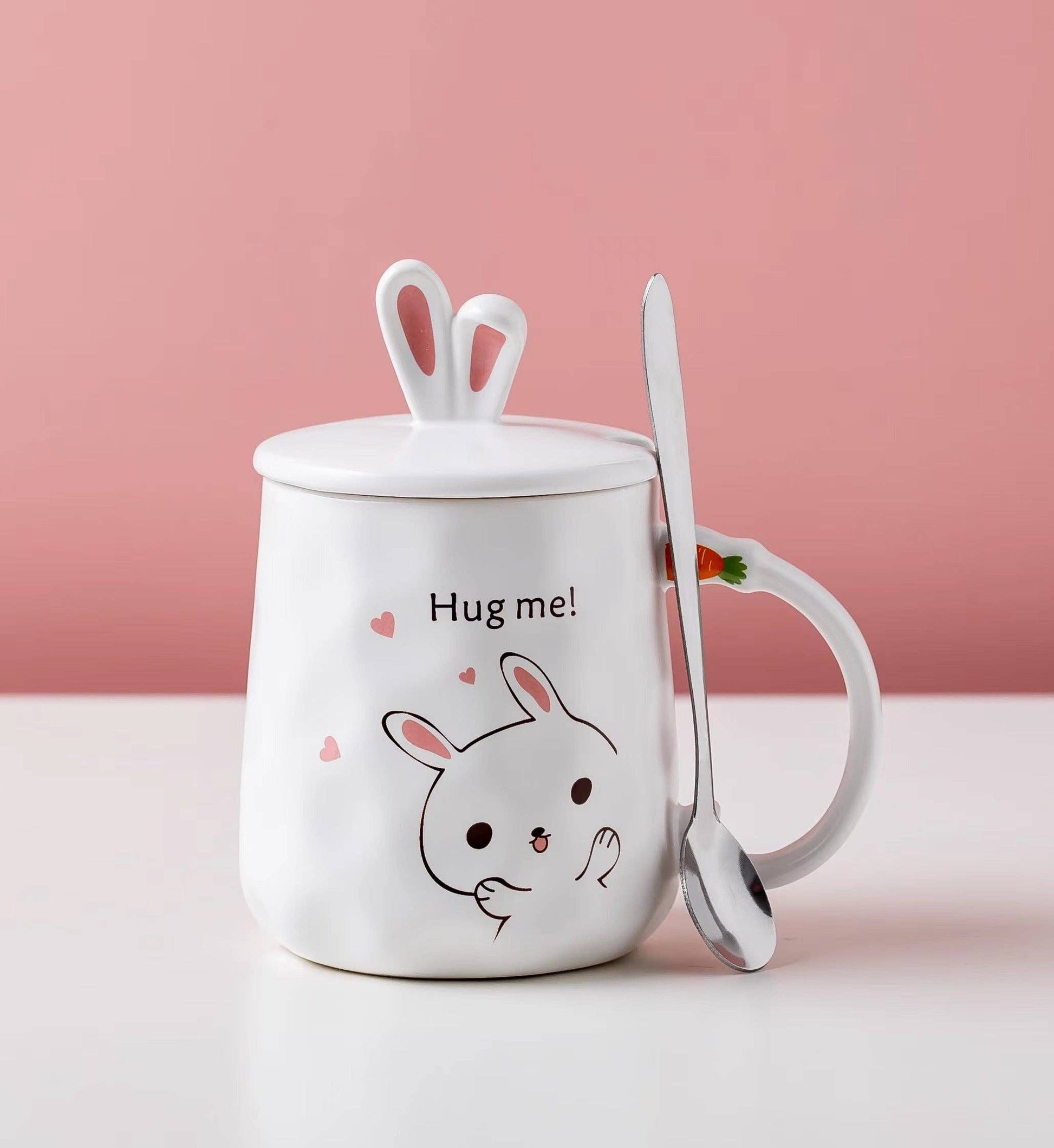 Bunny Tasse "Hug me" Weißer Becher mit Deckel und Löffel 400 ml