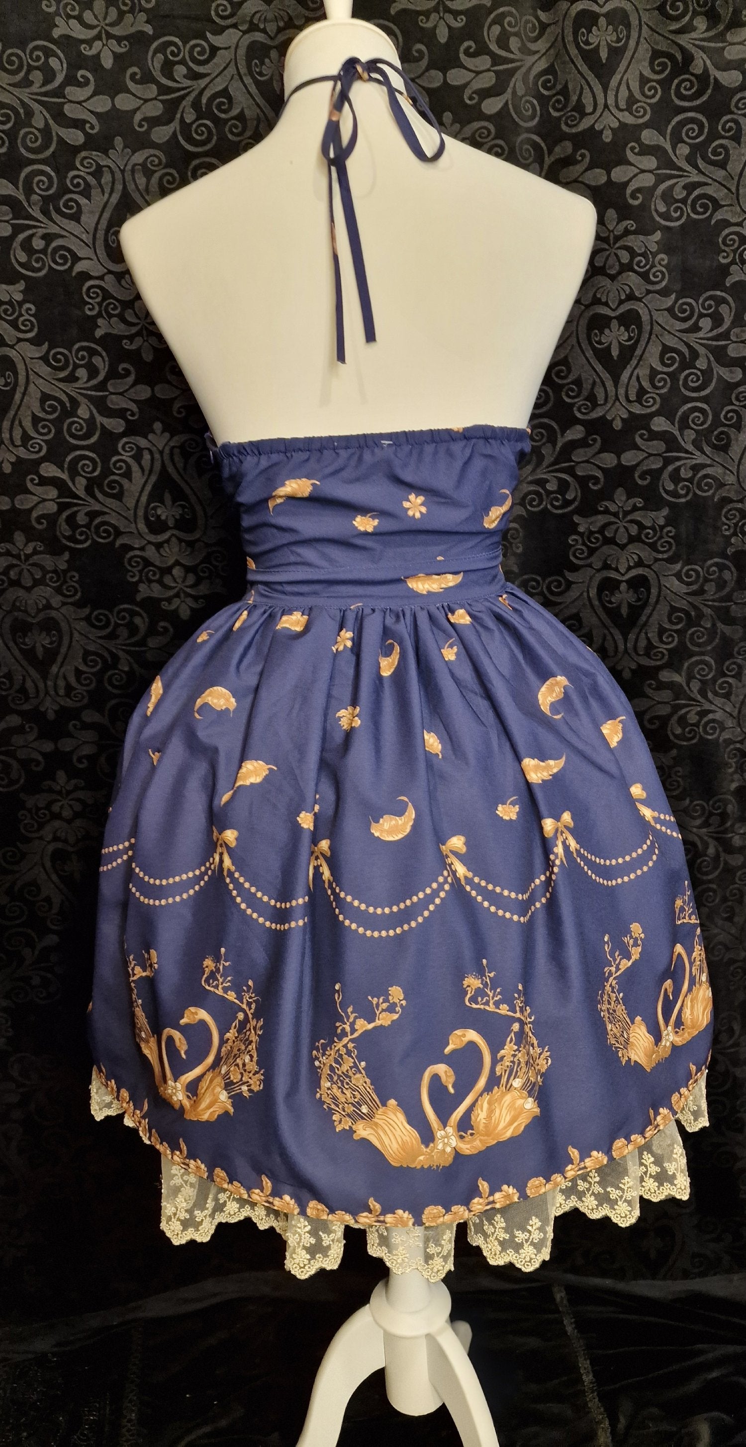 Classic Lolita Kleid Halter-JSK To Alice „Swan Crown“ Marineblau Gold mit Spitzenborte S