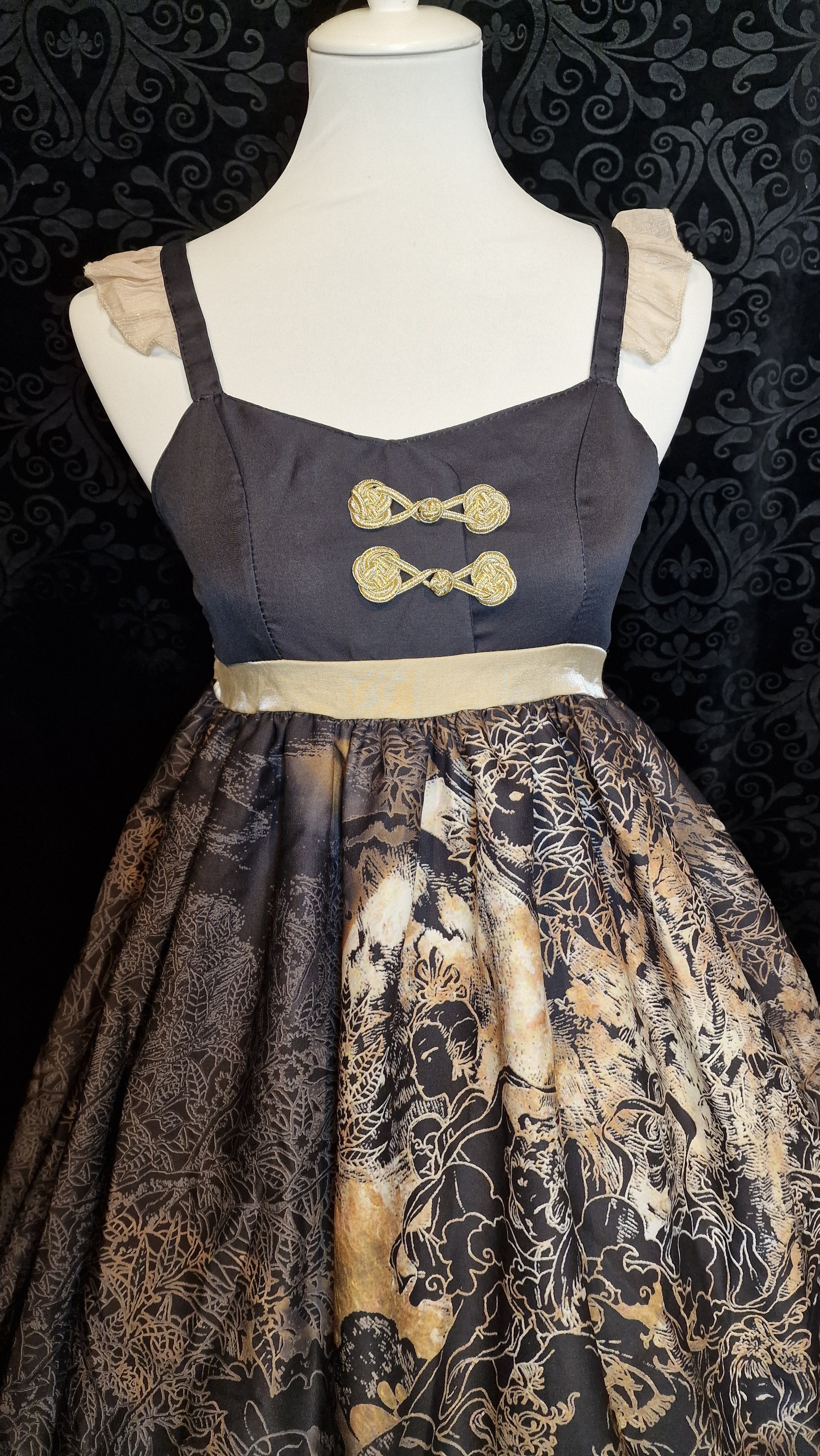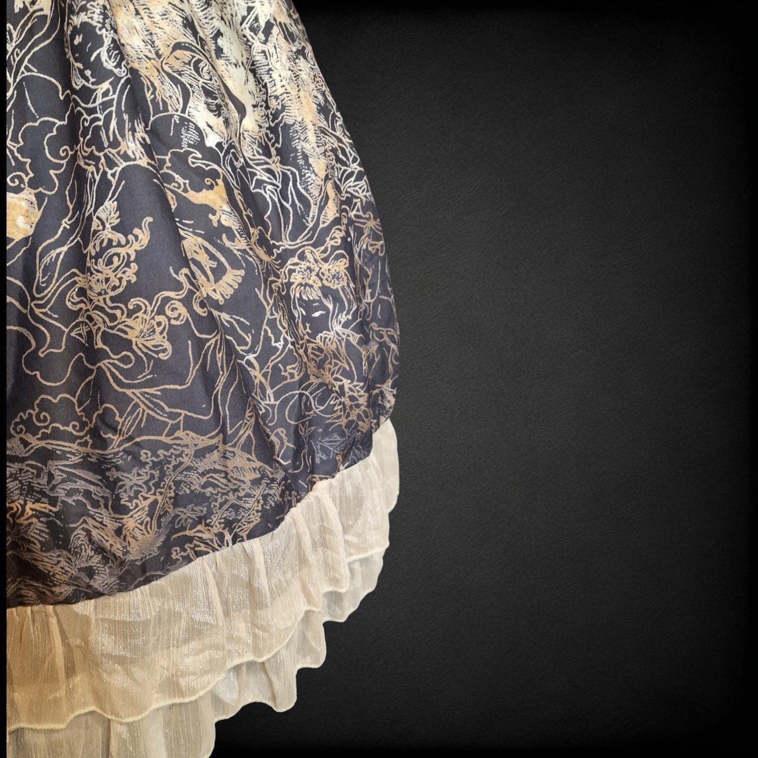 - Design: Dunkelgrauer/Schwarzer Satin-Oberteil mit cremegoldenem Taillienband; Glockenrock aus schwarzem Chiffon mit goldenem Drachen- und Pfingstrosen-Allover-Print.