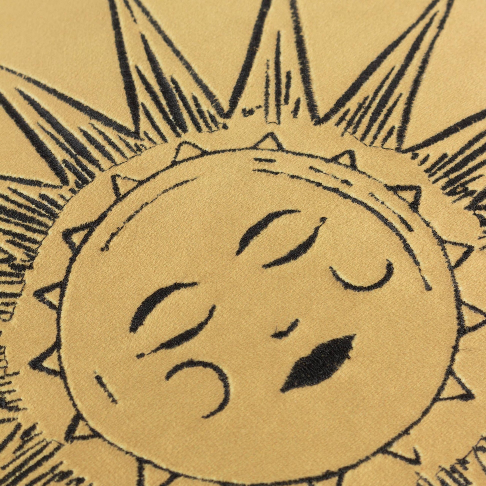 Bringen Sie mit unserem runden „Ethereal Sun“ Samtkissen himmlischen Glanz in Ihr Zuhause. Dieses kunstvoll gestaltete Accessoire ist mehr als nur ein Kissen – es ist ein Statement-Piece für alle Liebhaber von Astronomie, Boho-Chic und Vintage-Ästhetik.