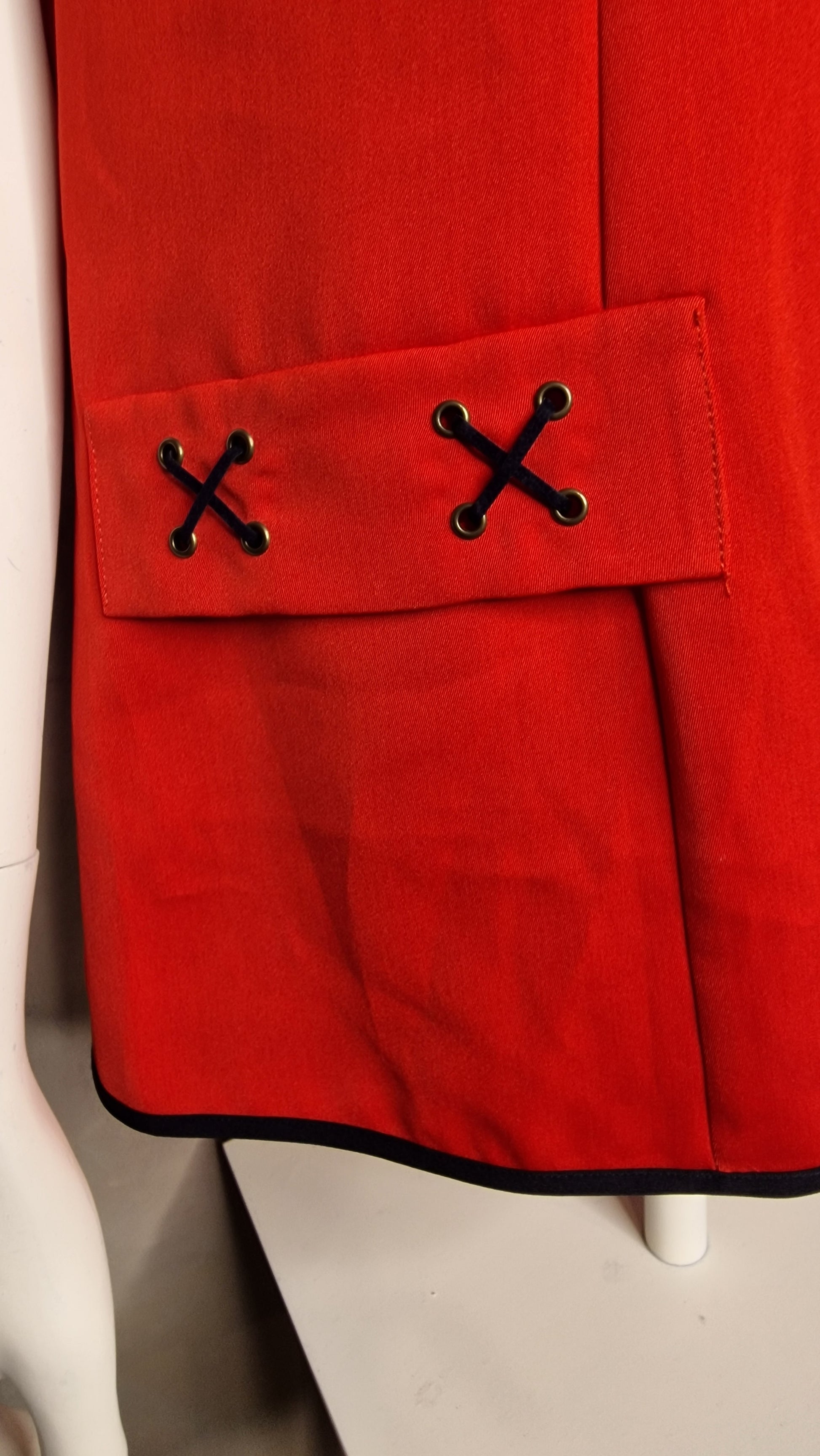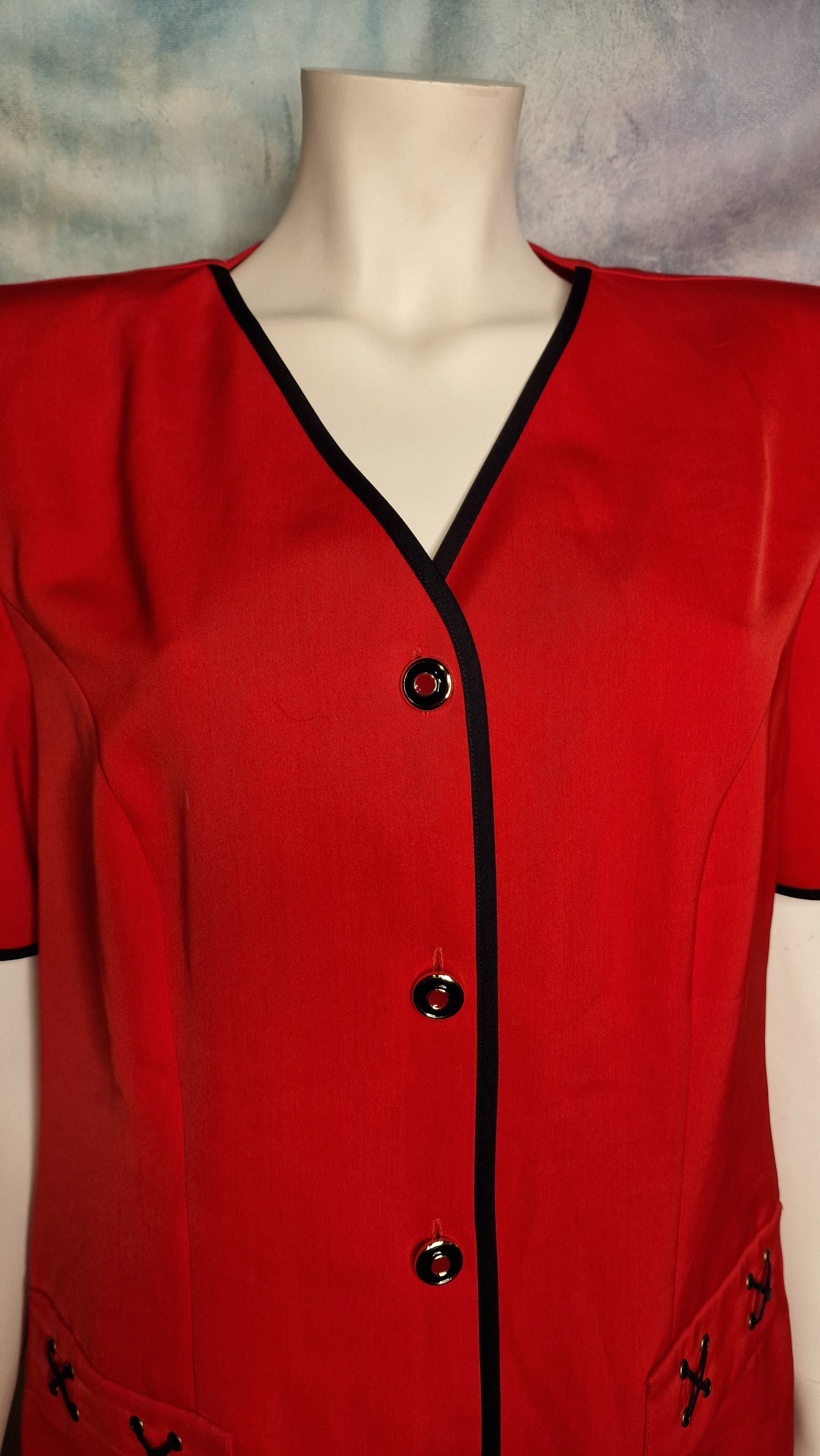 Elegante vintage Designer-Bluse von Nives Mora in leuchtendem Rot mit schwarzen Kontrastdetails. Dieses exquisite italienische Stück aus den 80er Jahren besticht durch seine klare Linienführung und die raffinierten Kreuz-Applikationen – ein zeitloses Statement-Piece für stilbewusste Vintage-Liebhaber.
