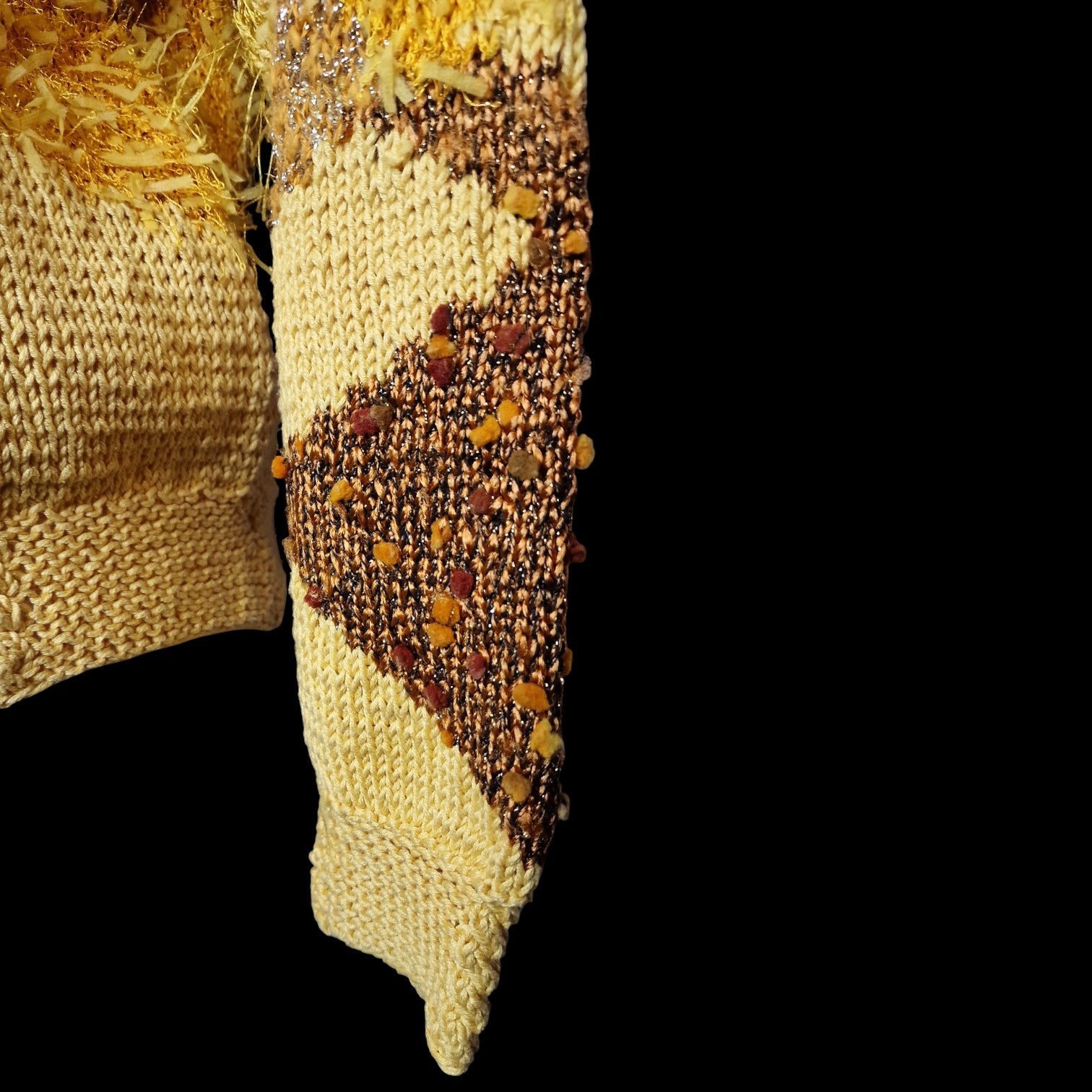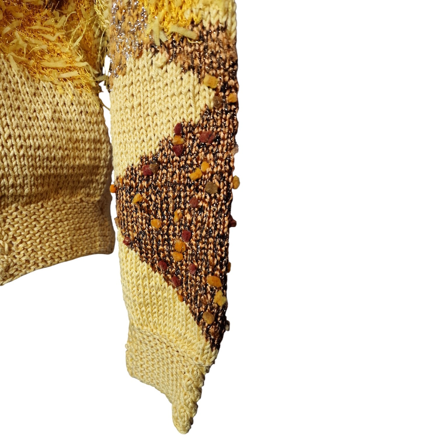 Dieser außergewöhnliche, handgestrickte Pullover ist ein echtes Sammlerstück der Vintage-Mode. Er besticht durch sein künstlerisches Patchwork-Design in warmen Erdtönen und die Kombination verschiedener Strickstrukturen, die ihm eine faszinierende 3D-Haptik verleihen.