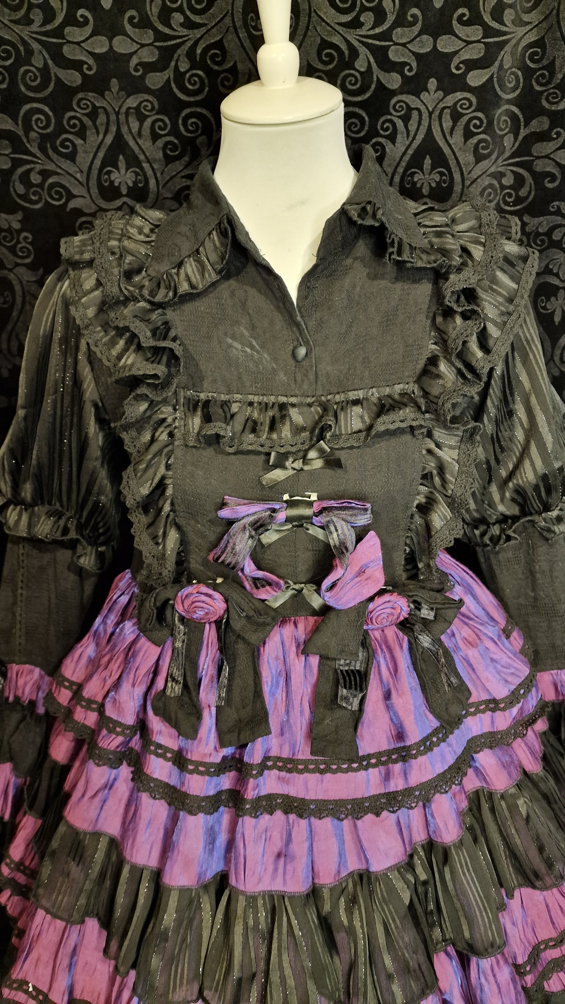 - Details: Zwei handgefertigte Satinrosen in Rosa/Lila an der Taille, lila Satinschleifen mit Metallspangen, schwarze Spitzenborte zwischen den Stufenlagen, schwarze Chiffon-Rüschen an den Ärmelenden und am Kragen, kleine Schleifenapplikationen an den Seiten des Rocks.