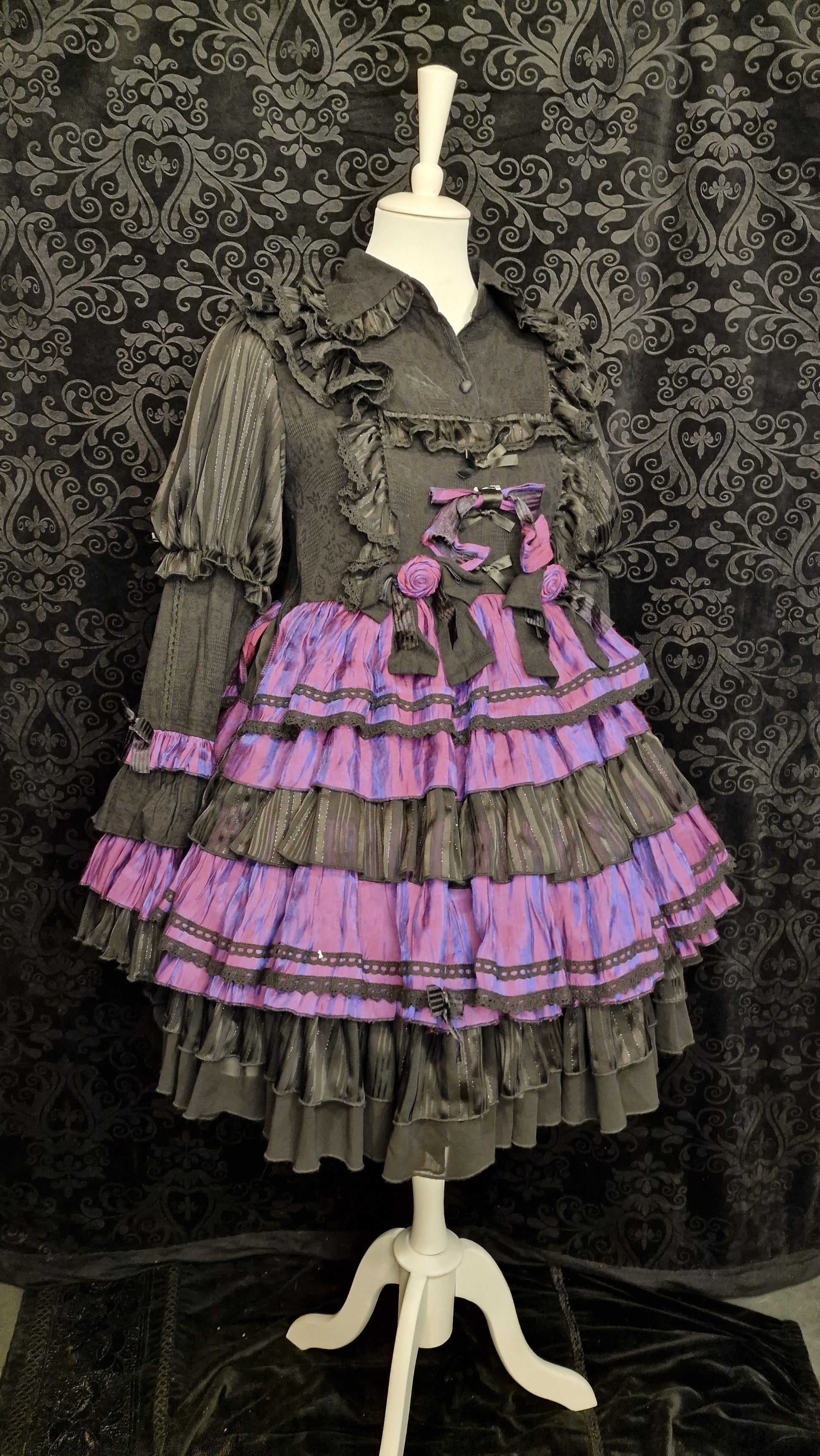 Gothic Lolita Kleid der Marke 花Lolita (Hua Lolita) (Original-Etikett vorhanden) – ein absolut dramatisches Statement-Piece, das dunkle Eleganz mit opulenter Verspieltheit vereint. Der irisierend-lila Taffeta-Stufenrock wechselt je nach Lichteinfall zwischen Lila, Pink und Schwarz – ein echter Hingucker.