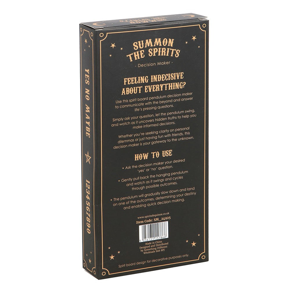 Dieser Entscheidungshelfer aus Metall im mystischen Design eines sprechenden Bretts verfügt über ein goldfarbenes Kugelpendel, das auf magische Weise eine von sechs Antworten auswählt. Stellen Sie einfach Ihre gewünschte Ja- oder Nein-Frage und beobachten Sie, wie das Pendel die möglichen Ergebnisse durchläuft und schließlich Ihr Schicksal bestimmt. Die perfekte Größe für Schreibtische und Beistelltische, um schnelle Entscheidungen zu treffe