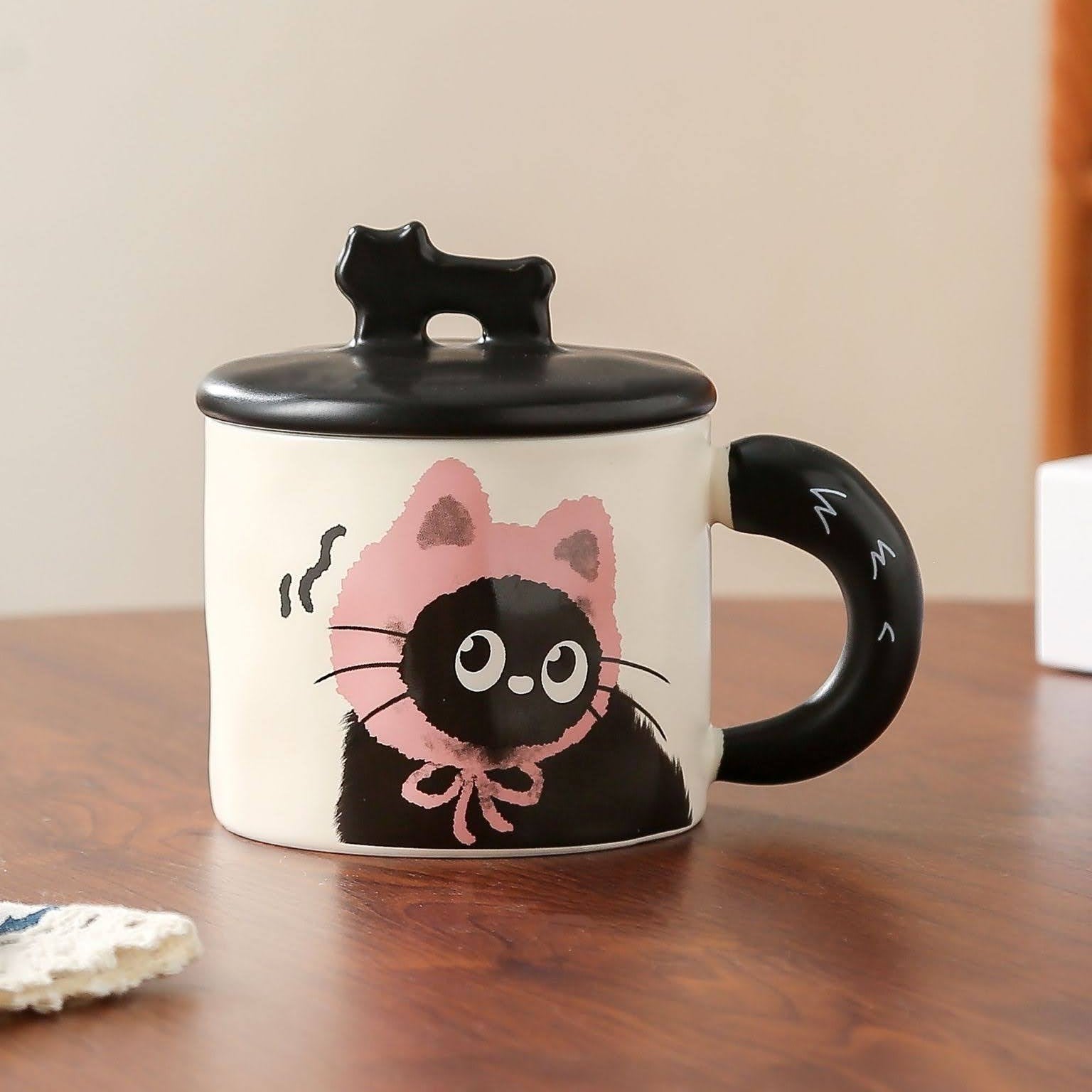 Entzückende Keramik-Tasse mit süßem Katzen-Motiv, inklusive Deckel mit Katzen-Griff und passendem Löffel. Die Tasse zeigt eine niedliche schwarze Katze mit rosa Mütze und Schleife - perfekt für Katzenliebhaber!