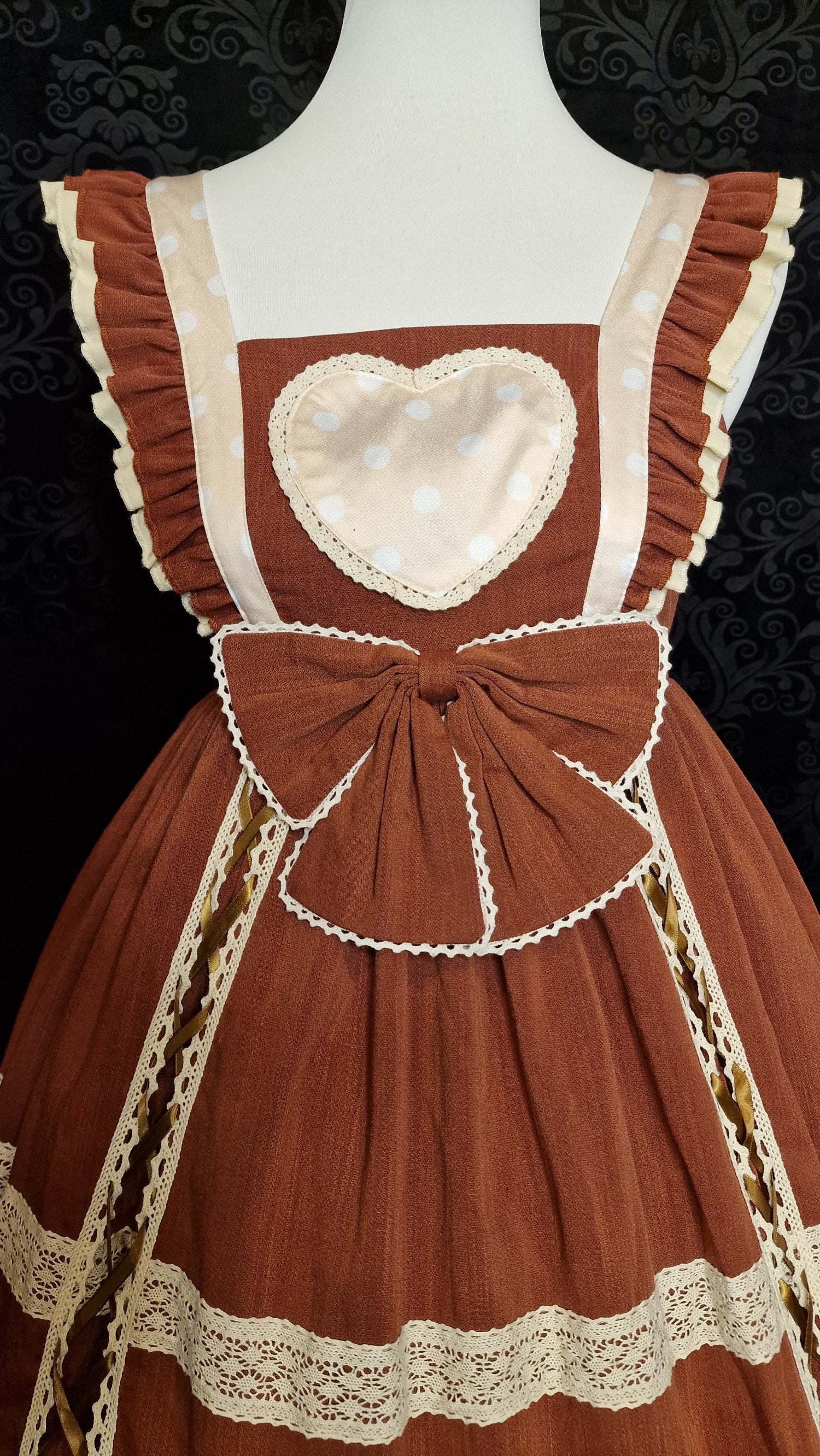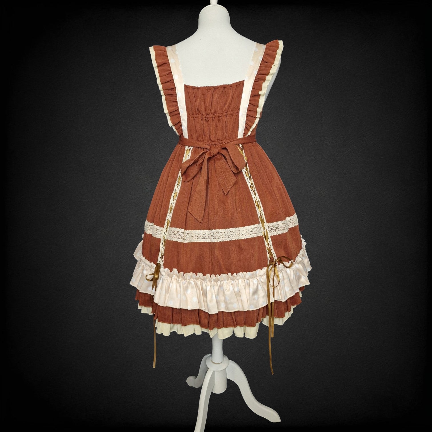 Verleihen Sie Ihrer Garderobe eine zuckersüße Note mit diesem aufwendig gestalteten Jumper Skirt. In warmem Schokoladenbraun und sanftem Creme gehalten, ist dieses Kleid ein Traum für alle Liebhaberinnen des Sweet-Lolita-Stils.