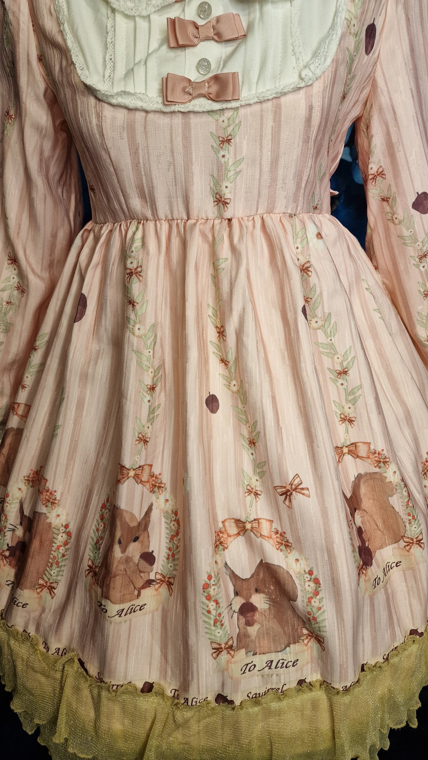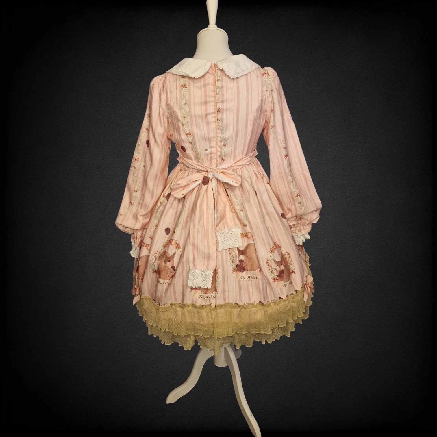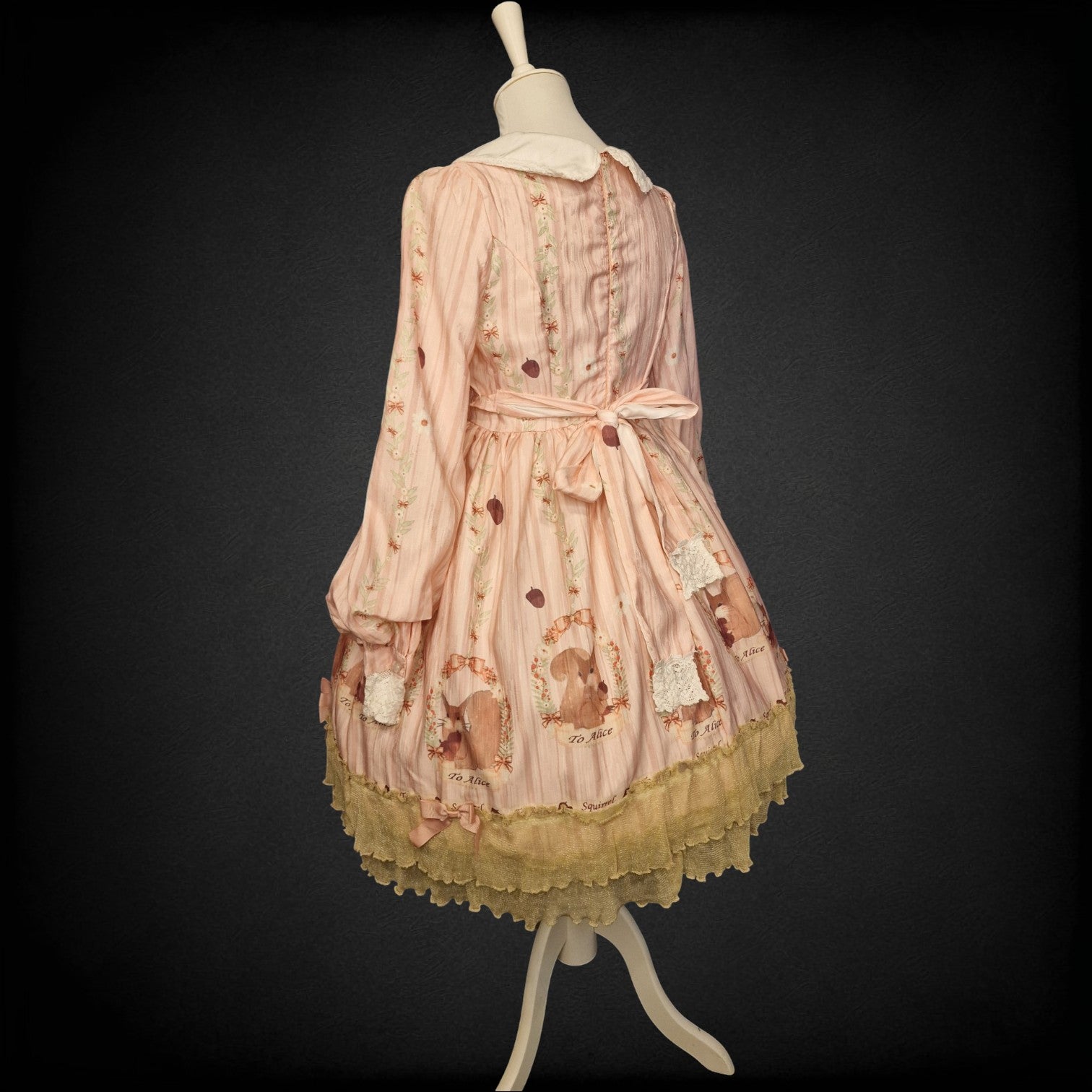 Romantisches Lolita One-Piece-Kleid von "To Alice" aus der in zartem Blush Pink. Das Kleid erzählt eine märchenhafte Geschichte: Niedliche Eichhörnchen in Blumenrahmen mit dem Schriftzug "To Alice" und "Squirrel" zieren den Rocksaum, während der gestreifte Stoff mit kleinen Eicheln und Sternendetails übersät ist. Der cremefarbene Peter-Pan-Kragen mit Spitzenrand und die drei zarten Satinschleifen am Vorderteil verleihen dem Kleid seinen unverwechselbaren Lolita-Charme. Der goldene Tüll-Rüschensaum rundet das Gesamtbild traumhaft ab.