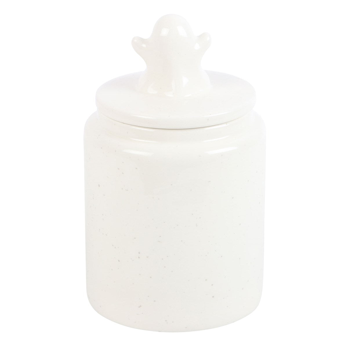Bewahren Sie Ihre Lieblings-Halloween-Leckereien mit diesem niedlichen Keramik-Vorratsglas vor bösen Geistern auf. Der orangefarbene „Hey Boo!“-Schriftzug auf gesprenkeltem weißem Hintergrund und ein charmantes Gespenst auf dem Deckel sind ein Hingucker. Lebensmittelecht.