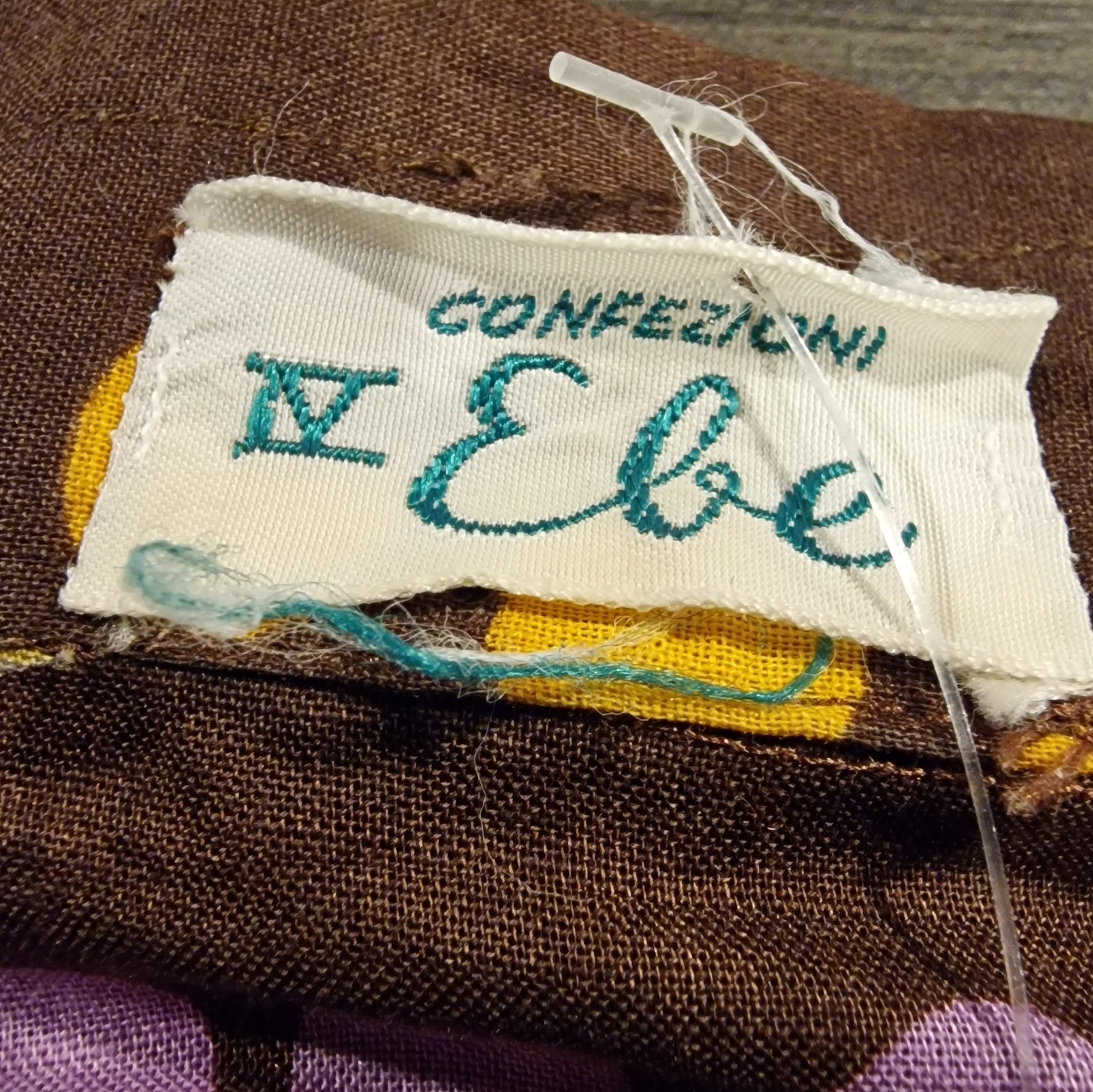 Spektakuläre vintage Bluse mit psychedelischem Punkte-Muster in Braun, Lila, Gelb und Weiß. Dieses außergewöhnliche Designer-Stück aus den 70er Jahren besticht durch sein hypnotisches Kreismuster, das an Aboriginal Art erinnert – ein echtes Statement-Piece für alle, die auffällige Retro-Mode lieben.
